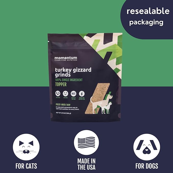 Momentum Carnivore Nutrition Freeze-Dried Turkey Gizzard Pet Food Topper – Single-Ingredient, All-Natural Topper – High-Protein for Dogs and Cats, Grain-Free and Made in The USA– (3.75 oz Bag)