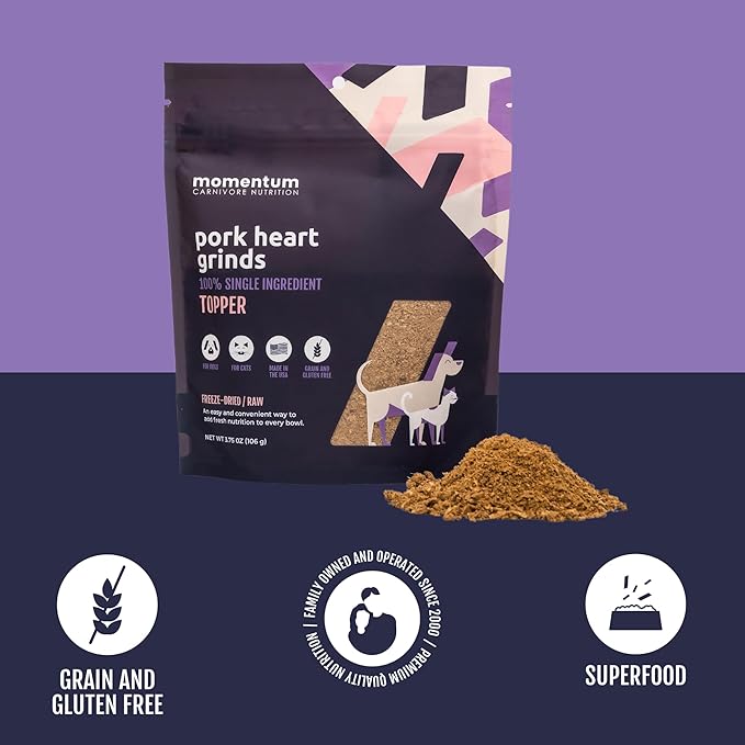 Momentum Carnivore Nutrition Freeze-Dried Pork Heart Pet Food Topper – Single-Ingredient, All-Natural Topper – High-Protein for Dogs and Cats, Grain-Free and Made in The USA– (3.75 oz Bag)