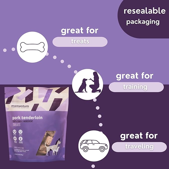Momentum Carnivore Nutrition Freeze-Dried Pork Tenderloin Dog Treats & Cat Treats – Single-Ingredient, High-Protein, Grain-Free, Lean & Naturally Tender – Made in USA – 3.5 oz Bag