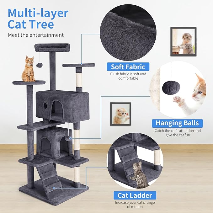 PayLessHere Cat Tree 54in Cat Tower with Cat Scratching Post,Multi-Level Cat Condo Stand House Furniture Kitty Activity Center with Furry Ball Toys Cat Tree for Indoor Cats (54in, Ashy)