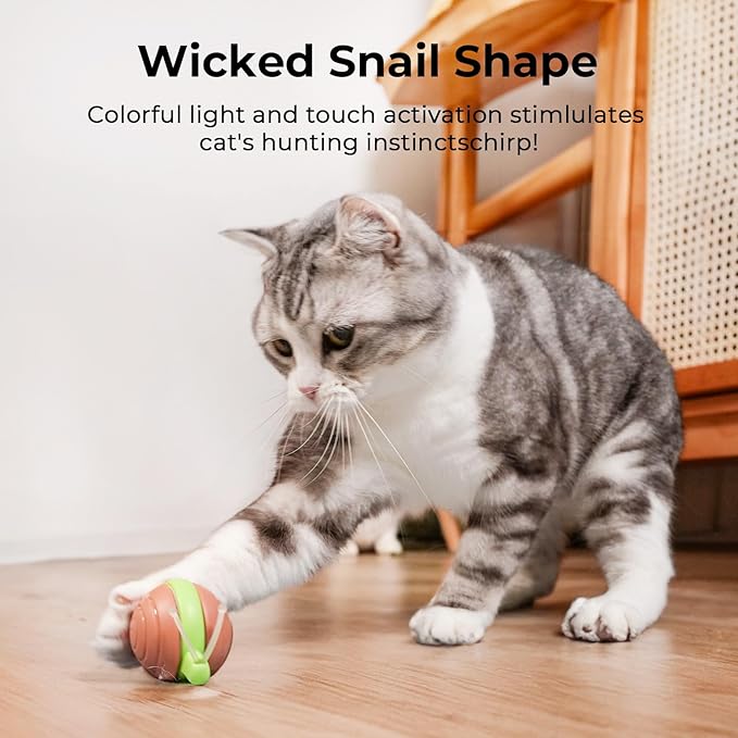 - 【Release Nature Instinct 】It's Wicked FUN!! This cat toy automatic with its bionic snail design and characterized by unpredictable movements, the wicked snail entices with light and motion, awakening your cat's natural hunting instincts and encouraging active play. Its snail-like design and unexpected movements, along with playful lights, spark your cat's hunting instincts for lots of active fun.