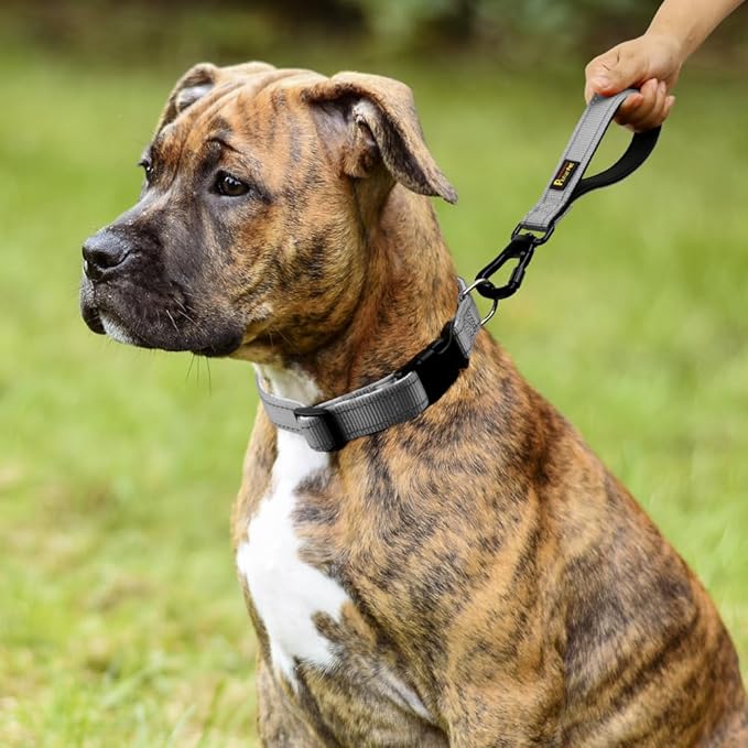 PLUTUS PET Short Dog Leash, Reflective Nylon Padded Handle, Strong Traffic Leash with Carabiner Clip, Perfect for Large or Medium Dogs (10”,Gray)