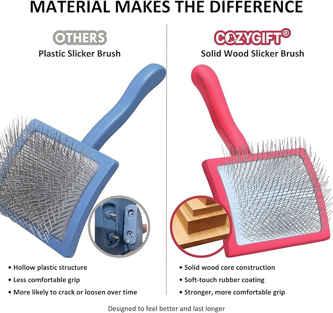 - ERGONOMIC WOODEN HANDLE – Large slicker brush and wooden grooming comb feature smooth, easy-grip wooden handles that feel secure while brushing big coats. Comfortable design helps reduce wrist and hand fatigue during long grooming sessions on heavy shedding pets.