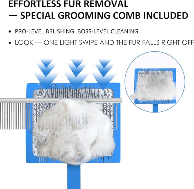 - EASY TO CLEAN & DURABLE – Stainless steel pins and comb teeth resist rust and are simple to wipe clean. Use the combs to rake trapped hair out of the slicker brush head in seconds, then store this 3 piece purple grooming set for your next dog or cat brushing session.