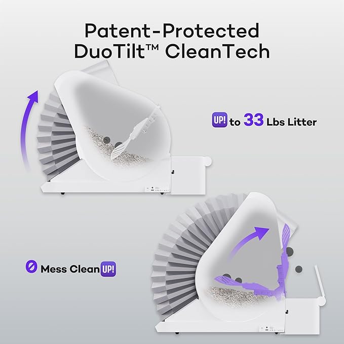 - 𝘾𝙡𝙚𝙖𝙣 𝗖𝗵𝗮𝗺𝗽𝗶𝗼𝗻: Two-stage tilting method combines passive & proactive operations (i.e. gravity sift and catapult dump) for thorough cleaning; leaves fewer scraps behind, dislodges sticky clumps, reduces dust created from abrasion, and minimizes stains trailed by runny poops