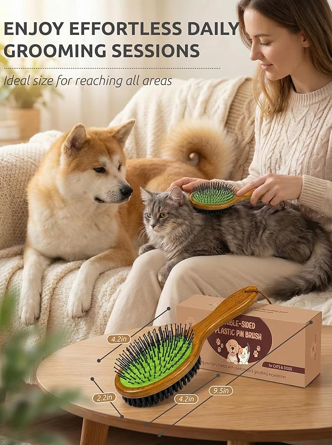 - Versatile 2-in-1 grooming solution: Simplify your pet care routine with this double-sided brush. One side features durable pins for effective detangling and removing loose undercoat hair, while the other offers gentle boar bristles for smoothing and adding shine.