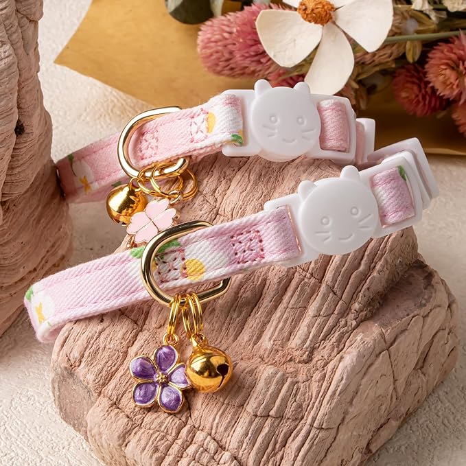2 Pack Cotton Breakaway Cat Collar Purple and Pink Flowers Pendant Cute Kitten Cat Collar with Bell