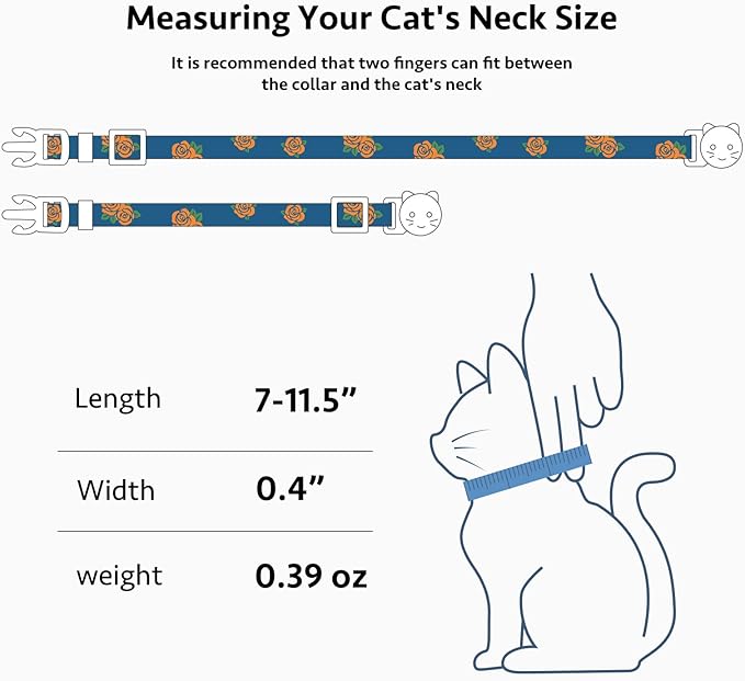 - Adjustable Size:Adjustable cat collars range from 7-11.5" inches in length, with a collar width of 2/5" inches,perfect for your little kitten or adult cat, Please refer to the product description picture to measure your pet's neck circumference before purchase to make sure the collar fits properly