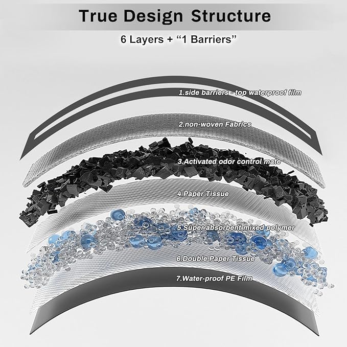 - Thicker Materials: True 6-layer thickened structure and one-layer side-barrier provide stronger absorbency. The thick back of pad does not get saturated and the waterproof PE membrane prevents liquid from leaking onto the floor/carpet. 100% confident in the thickness of these pads!