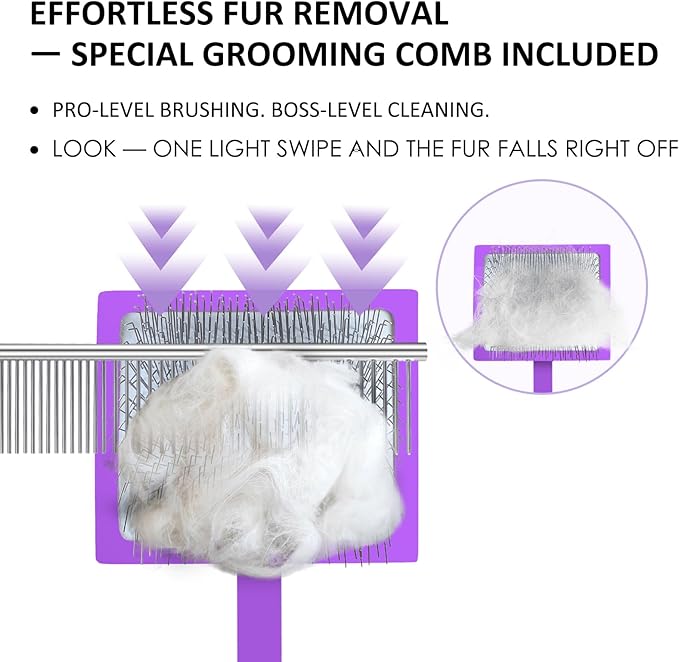 - EASY TO CLEAN & DURABLE – Stainless steel pins and comb teeth resist rust and are simple to wipe clean. Use the combs to rake trapped hair out of the slicker brush head in seconds, then store this 3 piece purple grooming set for your next dog or cat brushing session.