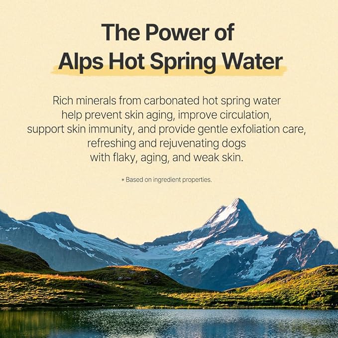 - Alps Hot Spring Water: Carbonated onsen water exfoliates residue from coat and skin, while boosting skin regeneration and immunity.