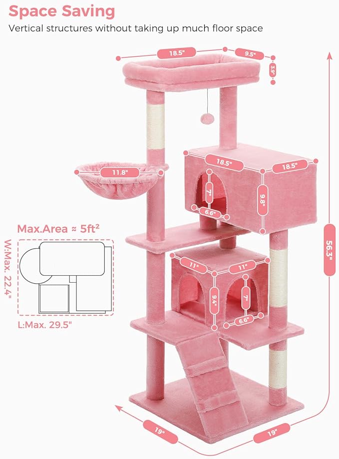 Pink Cat Tree for Large Cats with Super Large Top Perch,56.2" Multi-Level Tower for Indoor Cats with Hammock, Cat Shelves with Scratching Posts and 2 Condos Houses, Pink