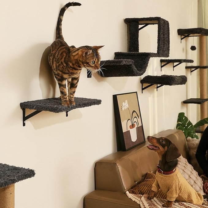 - ONE FOR ALL FUNCTION - The wall mounted cat furniture set includes cat bridge, cat wall bed, cat scratching post and cat shelf, your cats can sleep, jump, scratch, and play with these pieces, one set for all different demands. You also can DIY your own cat jungle gym according to different moving line, countless fun for both you and your cats.