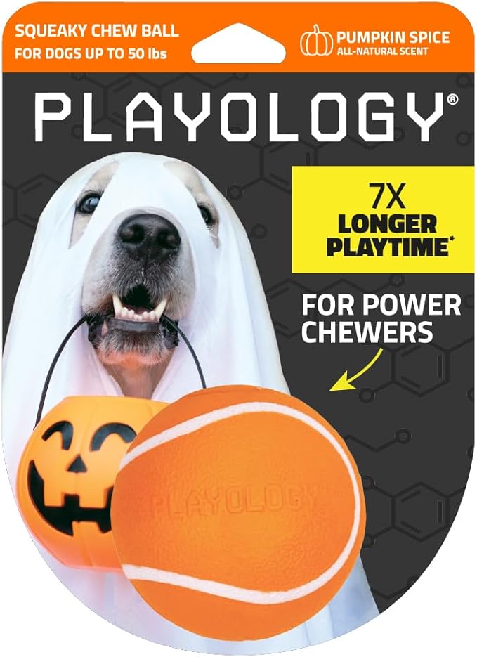 - MEET THE SWEATER WEATHER SQUEAKY CHEW BALL: Made with a fun squeak, playful bounce, and embedded with an all-natural Pumpkin Spice scent, this ball is scientifically designed to excite multiple senses and keep your dog busy and engaged in playtime up to 7x longer than unscented dog toys. Mix and match with other limited-time Sweater Weather scents and styles to keep your pup’s tail wagging all season long. Designed for medium breed dogs up to 50 lbs.
