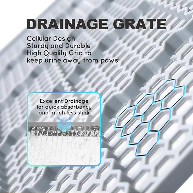 - Sturdy Grate : The plastic grate layer keeps the dog turf separated from the pee pad. The holes are well spaced so the pee goes straight through to the pee pad. The grate is a sturdy, heavy duty plastic.