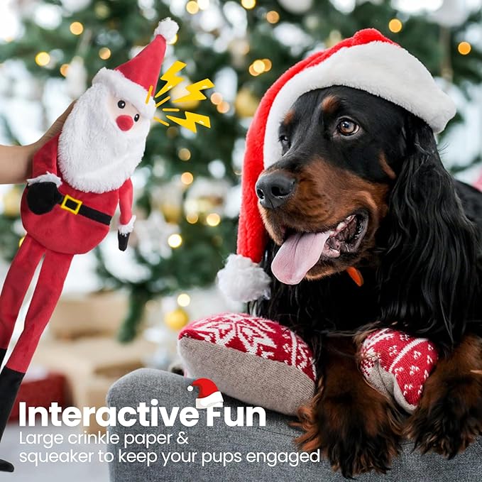 - Crinkle & Squeaky Dog Toys: Our Christmas dog toys for medium dogs feature built-in squeaker and large crinkle paper that your dog loves. When your pet bites or paws the dog toys for aggressive chewers, it makes satisfying sounds that will stimulate their desire to play and keep them entertained all day long. Great christmas dog toys to keep them busy and happy