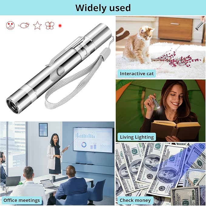 - 【Multiple Function】The cat wand toy is versatile. It can also be used as a pointer for presentations, with a bright beam for clear visibility. You can turn it on with a single push, no need to hold down the button. The lighting mode can glow in the dark, and the purple mode can detect counterfeit money.