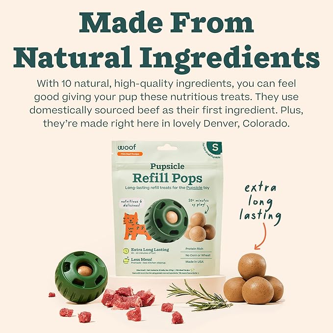 - Made in USA: At Woof, we create thoughtfully designed products so you can tell your dog “I love you” in a way they’ll understand. Man's best friend deserves safe, clean, and long-lasting fun, and you deserve the quiet that comes with it. Pupsicle Refill Pops are a wonderful way to keep dogs busy with the long-lasting Pupsicle toy.
