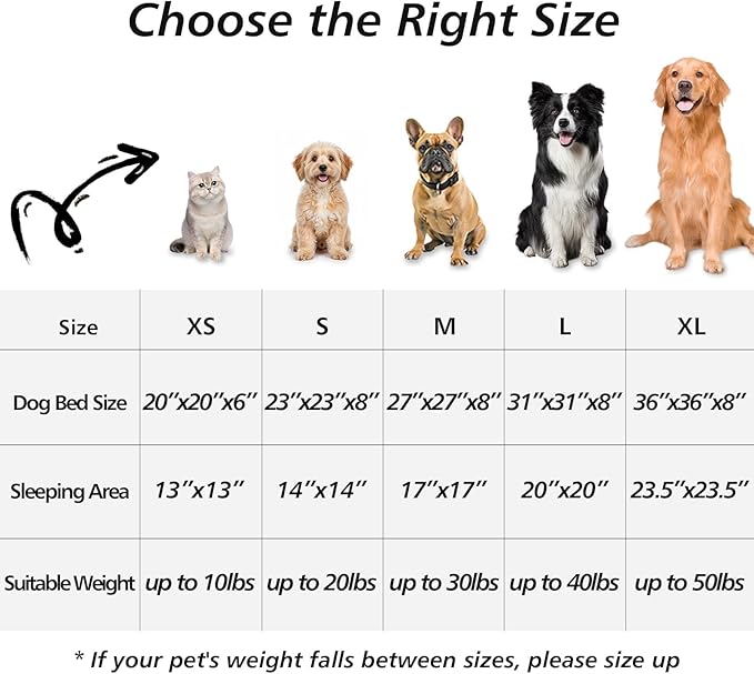 - Choose the Perfect Size for Your Pet: We recommend referencing the weight limit and sleeping style: 20-Inch: Pets up to 15 lbs (Kittens, Chihuahuas, Yorkies); 23-Inch: Pets up to 25 lbs (Pugs, Frenchies); 27-Inch: Pets up to 35 lbs (Beagles, Spaniels); 31-Inch: Pets up to 45 lbs (Bulldogs, Corgis); 36-Inch: Pets up to 75 lbs (Labradors, Golden Retrievers). Pro Tip: When in doubt or if your pet loves to stretch out, always size up for extra comfort