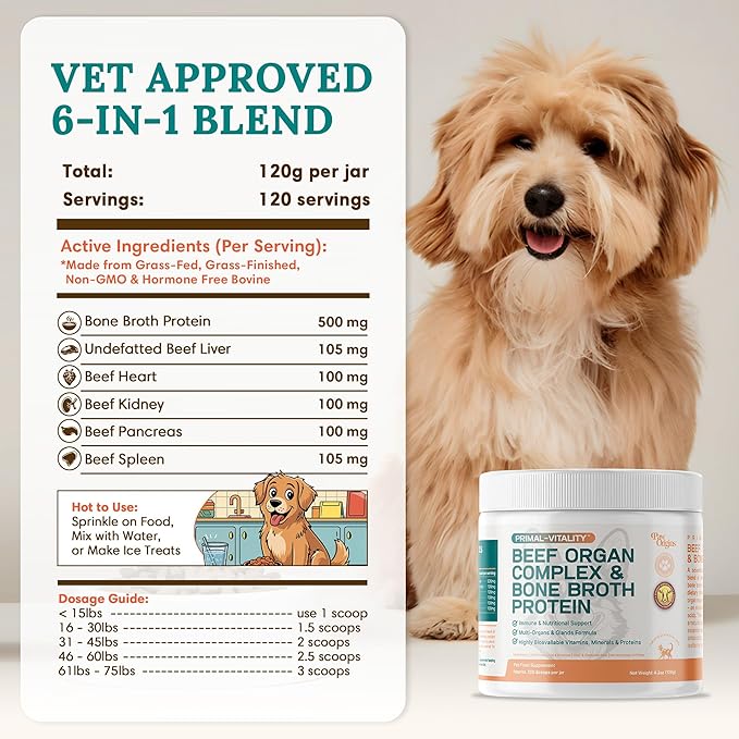 PawOrigins® Primal-Vitality™ Bone Broth Powder for Dogs – Grass-Fed Beef Organ Complex with Liver, Heart, Kidney, Pancreas, Spleen & Bone Broth Protein – Natural Dog Food Topper, 120 Servings