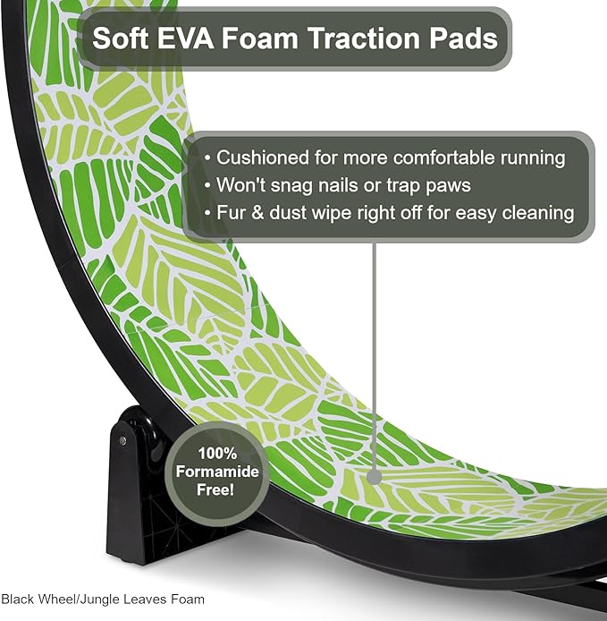- TRACTION PADS - The interior of the wheel is lined with adhesive pads to provide traction. Comes in two options: Foam or Felt. The foam is super soft and easy to keep clean, but will show scratch marks faster. The felt is more durable against claw marks and scratches, but fur sticks to it more easily. Jungle Leaves pads are made from foam.