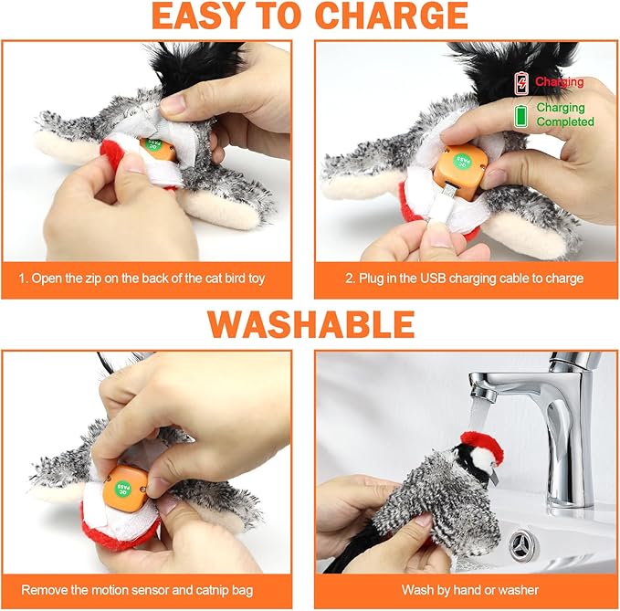 - BEST CAT GIFT: Only after removing the activity sensor and catnip bags, this electric cat bird toy can be washed by hand or a washing machine. Looking for a Daily gift or interactive cat toy for your kitty? This chirping flapping bird cat toy will be a nice choice for you. Any other questions, please feel free to contact us, we will answer your within 24 hours.