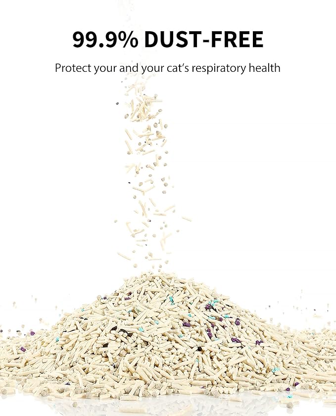 - LOW TRACKING AND DUST FREE: The larger granules of the cat litter reduce tracking by minimizing adherence to your cat's paws, keeping floors clean. Going through advanced 7 stages of dust removal process, this 99.9% dust-free cat litter prevents airborne particles during refills and waste covering, caring for the respiratory health of you and your cats.