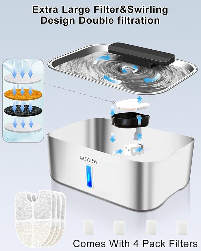 - 【Comes With 4 Pack Extra Filters】The stainless steel dog water fountain includes 4 pack extra filters,keep you using for a long time while save the cost of replacement filters.The larger filters can effectively dropping dirt debris and shedding fur,always provide clean and fresh water.Also the larger filters can extend the replacement time and save cost.Please search "B0DRVQSTCY" to buy replacement filters,"B0DYYFP7BP"to buy replacement pump.