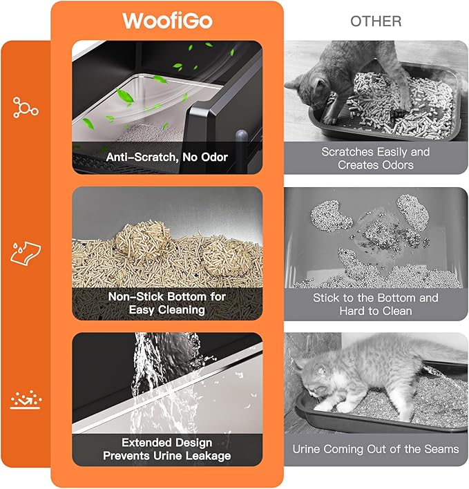 - 【Lasts 3-5 Years】This will be your last litter box, WoofiGo's high sided stainless steel litter box lasts 3-5 years and will minimize the hassle of frequently changing litter boxes.