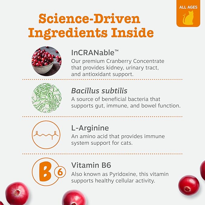 - Made with InCRANable – This cat cranberry urinary supplement formula contains a premium form of Cranberry Concentrate to provide kidney, urinary tract, and antioxidant support for indoor and outdoor cats of all ages and sizes