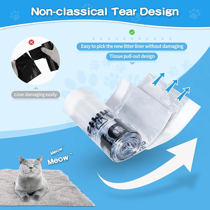 - Everything is designed for your convenience, that's why our cat litter box litter bags have a pre-separated design, with the pre-separated design, these waste bags are separated one by one to avoid tearing the litter bag. Use is as easy as pulling out a paper towel, with a gentle tug to remove the litter waste bag.