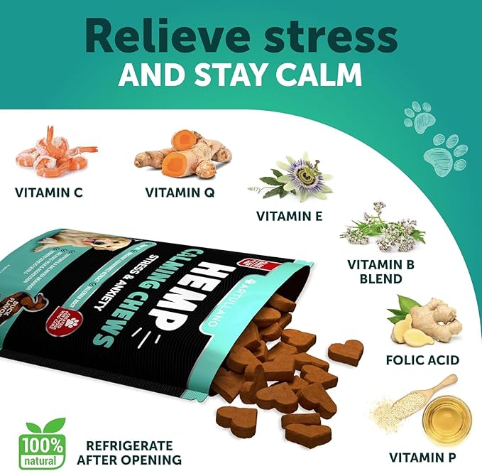- Natural Calming Aid: dog calming chews - anxiety relief treats support help relieve your pet of any stress or anxiety using natural ingredients like passionflower, chamomile, hemp powder, hemp oil