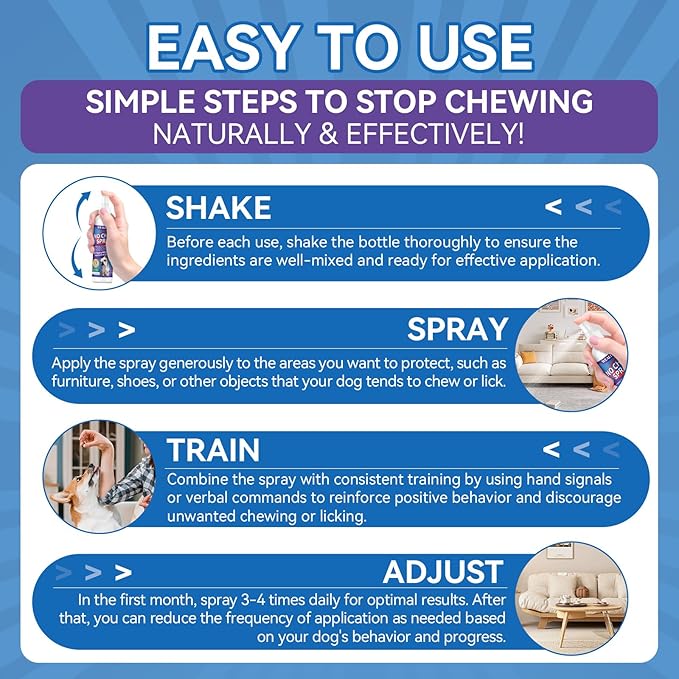 - Effective Training Aid – No More Yelling! No need for scolding or punishment! Simply spray the no-chew deterrent on unwanted chewing spots 3–4 times daily at first, then gradually reduce as your dog learns. Perfect for correcting behavior in puppies and adult dogs alike.