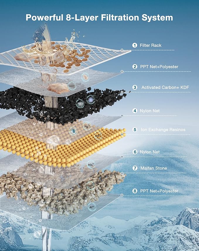 - 8-Layer Filtration System: The fountain filter features an 8-layer filtration system with high-density microporous components, consisting of PPT Net, nylon net, activated carbon, KDF, ion exchange resin, and Maifan stone. Offer a healthier and cleaner water supply for your pet compared to products with only two or three filtration materials.