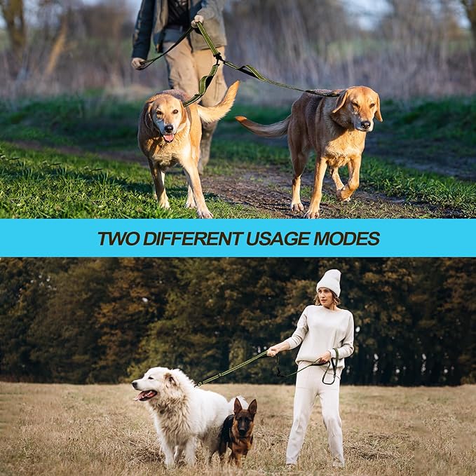 - No Tangle Double Dog Leash: 360° swivel clasps help to keep your dogs from getting tangled together. No need to worry about getting twisted two dog leash when dogs switch sides
