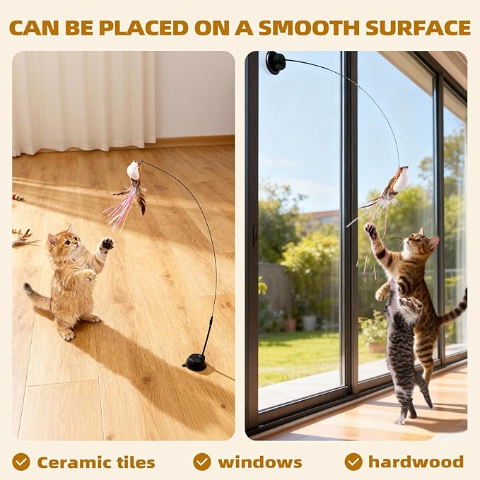 - Durable, safe, and easy to install: The suction cup can firmly adhere to flat surfaces such as tiles and glass, and the toy pole is flexible and durable; Feathers and handles are made of natural materials, ensuring safety and no hidden dangers. Accessories are easy to replace and suitable for cats of all ages and body types