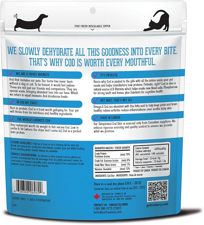 - NATURAL COD SKIN TREATS FOR DOGS & CATS HIGH IN PROTEIN - Our cod skin dog treats are a 100% natural dog treat that’s dehydrated, preserving vital nutrients, packed with vitamins and minerals, and healthy oils. These treats are high in protein, rich in omega-3 fatty acids, chemical-free, and have zero additives or preservatives. This makes them the ultimate cod for cats and cod skins for dogs, promoting their well-being and vitality with natural, raw protein. Nutritional support at its finest!