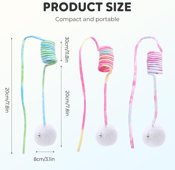 - INTERACTIVE TOYS FOR CATS: The dangling plush balls encourage your cats to jump, swat, and pounce. The bells ring with a clear ring, attracting your pet's attention and keeping them happy. Bright colors that will please your cat and make your relationship closer