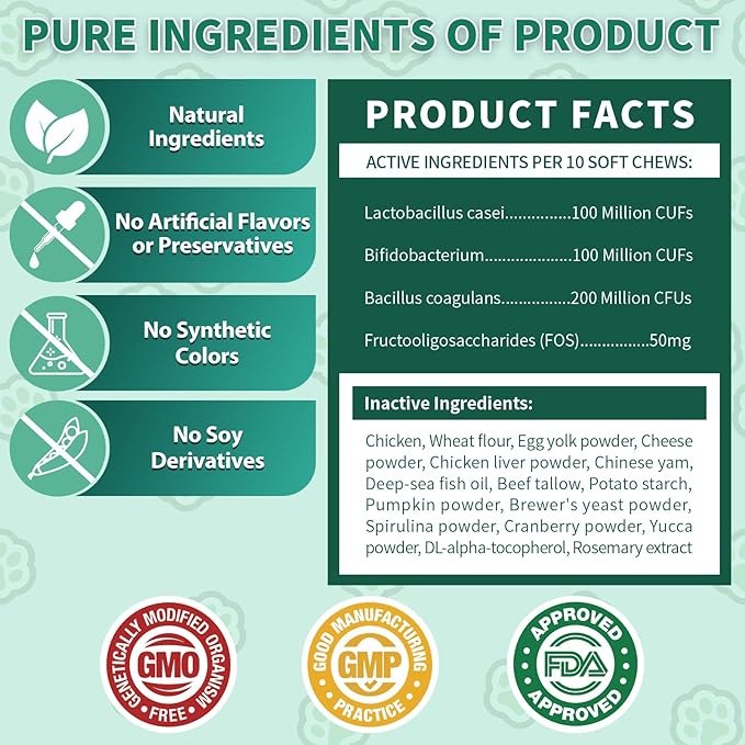 - Clean & Safe Ingredients You Can Trust -Made with premium chicken, pumpkin, spirulina, natural oils and brewer’s yeast, this cat probiotic supplement contains no soy, wheat, or artificial additives. Tasty and effective support for digestion, skin, and coat health—suitable for cats of all breeds and ages.
