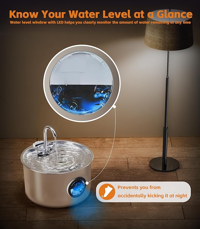 - At-a-Glance Water Volume Management: With UPAWPIA cat water fountain, forget about fumbling with lids to check water levels! Simply glance at the LED water level window of our cat fountain to determine if refilling is necessary - no more guesswork or interrupted sleep checking water levels. Scratch-resistant, high-quality glass ensures long-lasting clarity and combines practicality with modern aesthetics.