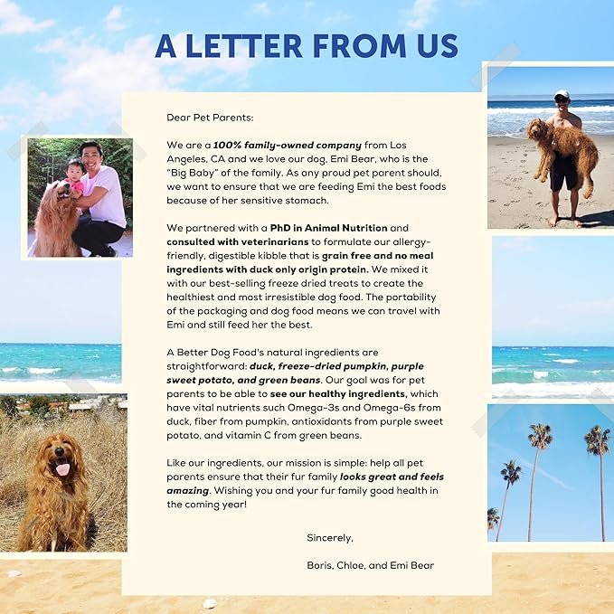 - A BETTER DOG FOOD, YOU CAN TRUST: Our dog food is made with real, recognizable ingredients you can see! No chicken, no meal ingredients, grain free, minimally processed, and only duck animal protein to make a highly digestible allergy friendly healthy and natural food. A Better Dog Food is made in the USA and our mission is to deliver the healthiest, most irresistible dog food to our fellow pet parents!