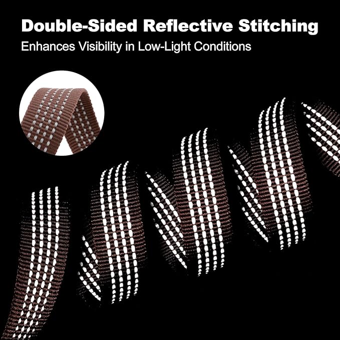 - Double-Sided Reflective Nylon Webbing. Crafted from reinforced nylon, the leash includes reflective stitching on both sides, helping improve visibility during early morning or nighttime use. A practical choice for safety-conscious pet owners