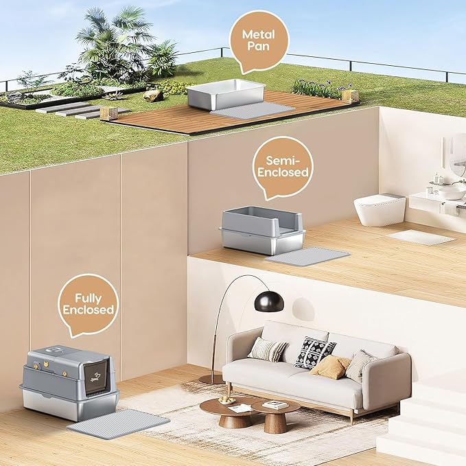 - 【Innovative Flip-Top Design + 3-Layer Assembly】The stainless steel covered cat litter box features a flip door design, making cleaning simple and effortless. Easily open the lid to clean without removing the entire cover. With an easy-to-assemble 3-layer detachable shell, it offers both fully enclosed and semi-enclosed configurations.