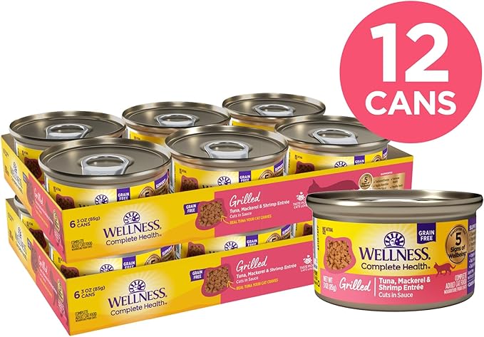 Wellness Complete Health Grilled, Adult Wet Cat Food, Natural, Protein-Rich, Grain-Free, Canned, 3 Ounce, 12 Pack, (Tuna, Mackerel & Shrimp Entrée Recipe)