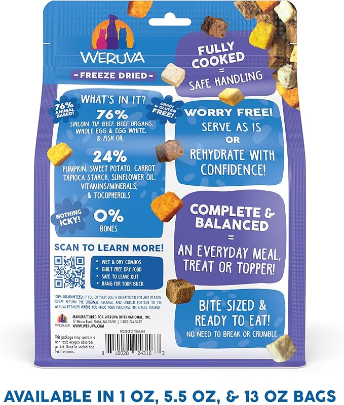 - Weruva Dog Freeze Dried, Steak Frites Dinner, 5.5oz Bag. Gently cooked with 76% sirloin tip, beef, beef organs, whole egg, egg white, and fish oil. No bone, just real beef and real flavor