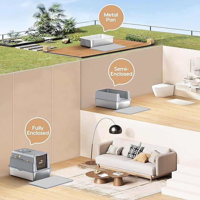 - 【Innovative Flip-Top Design + 3-Layer Assembly】 The stainless steel covered cat litter box features a flip door design, making cleaning simple and effortless. Easily open the lid to clean without removing the entire cover. With an easy-to-assemble 3-layer detachable shell, it offers both fully enclosed and semi-enclosed configurations.