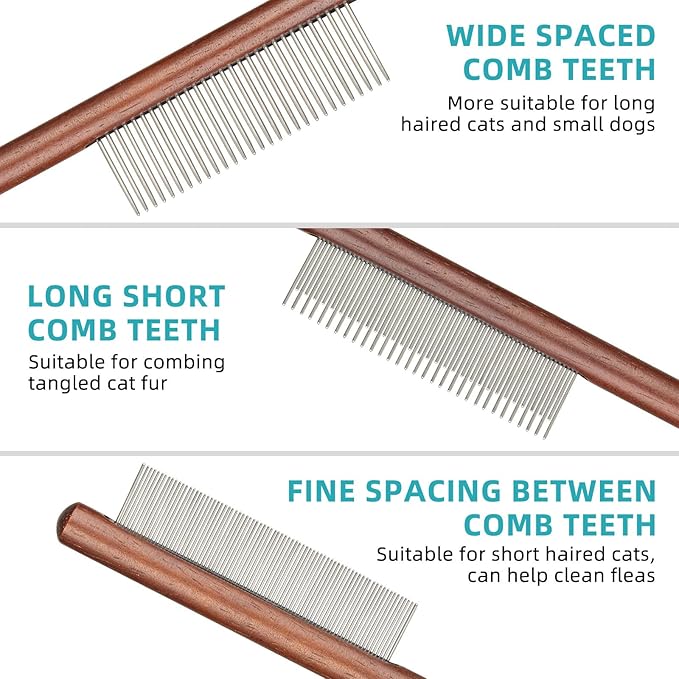 - 【With three densities】Wide-tooth comb: suitable for long-haired cats, small dogs. Close-toothed comb: suitable for short-haired cats, flea removal Long and short teeth: suitable for deep knotting to remove floating hairs.