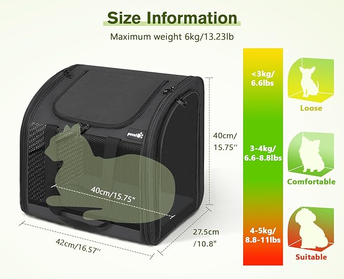 - 【 Widened Design, Increased Space 】: This widened cat backpack by Pecute has a larger and wider interior space compared to regular pet carrier backpacks, allowing pets to lie comfortably inside and freely change positions. The dimensions of the cat backpack carrier are 16.5in in length, 10.8in in width, and 15.7 in height, with a maximum carrying capacity of 17 lbs. Before purchasing, please measure your pet's sitting height not exceeding 14.9in and lying length not exceeding 15.7in!