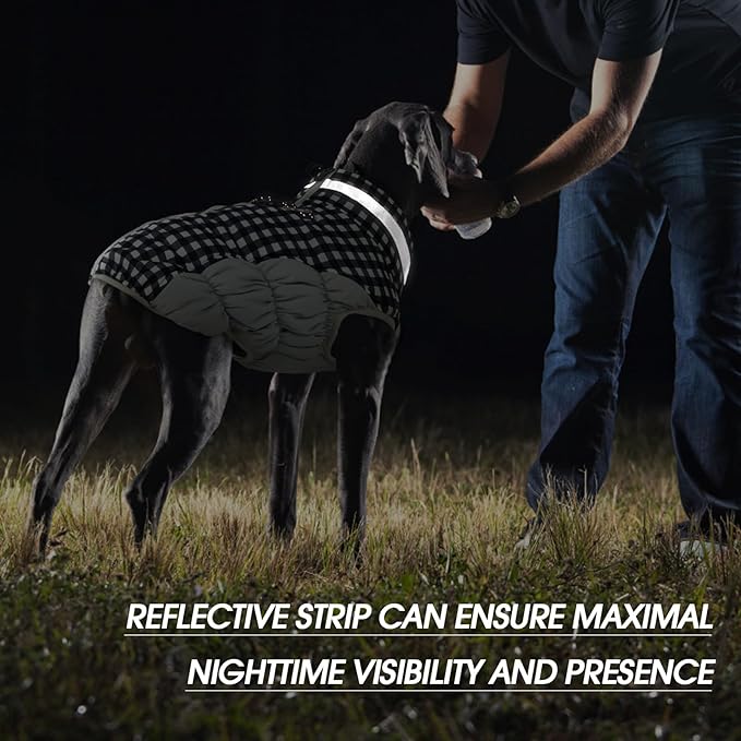 FUAMEY Dog Coat for Large Dogs,Waterproof Dog Winter Jacket with Harness Built in Puppy Cold Weather Coats Reflective Pet Vest with Zipper Warm Fleece Dogs Snowsuit Windproof Checkerboard L
