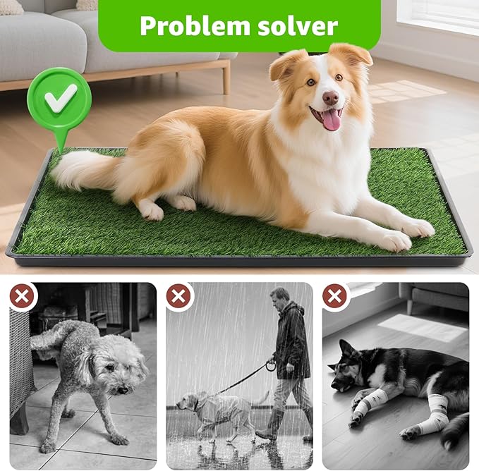 - Extra Large Pet Loo: The grass pads for dogs with a large tray size is 45x29 Inches make it ideal for medium or large dogs. The indoor dog potty is designed for your pet's ideal experience looks and feels just like real grass. Not only that, but your dog will love on their grass pad with a tray while business, keeping their paws clean and staying safe and healthy all the while.